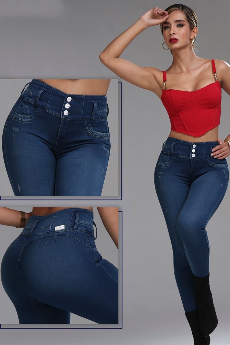 Este jean combina estilo, comodidad y un efecto moldeador inigualable. Con tiro alto y una pretina ancha de triple botón en contraste blanco, logra una silueta más definida y estilizada, mientras que su diseño levanta cola realza tus curvas de manera natural. El tono azul oscuro con sutiles desgastes le da un toque moderno y versátil.